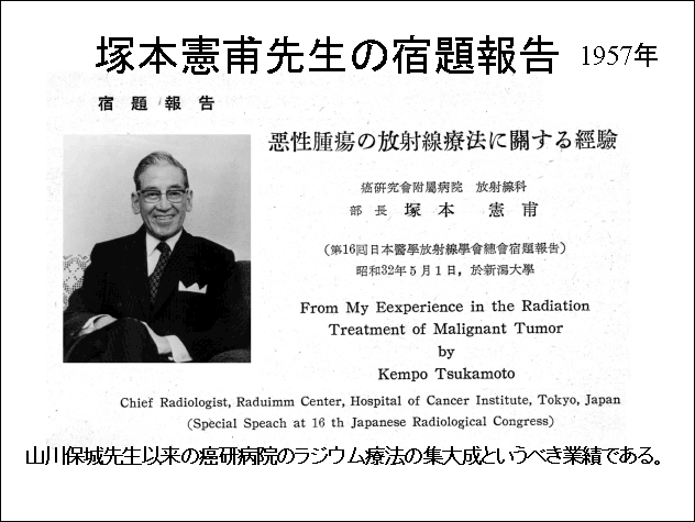 塚本先生は戦後の癌治療特に放射線治療の原点というべき方でした。先生は癌研の持つラジウムの威力をフルに発揮したラジウム外科というべき分野を開拓されて、国際的にも高く評価される治療成績を残されました。その成績はスライドに示された1957年の日本医学放射線学会宿題報告の論文に要約されています。
