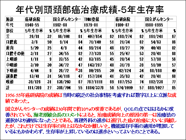 スライドは1945年の戦後から現在までの代表的な頭頚部癌治療成績を年代順に示しています。頭頚部癌は子宮癌とともに早い年代から放射線治療の対象となり良好な成績を挙げていて、塚本先生がもっとも得意とされた領域でありました。 1950年代まではラジウム治療の時代、1960年代から高エネルギ-放射線治療、1980年以降は再建手術と化学放射線治療の導入の時代といえるでしょう。 年代別の成績を概観しますと、治療後5年生存率は塚本時代の27%から国立がんセンター創設時代には55%と倍増しております。この数字はまさに戦後の日本の国力の回復を示す数字であると私は考えております。戦後まもなくのあの窮乏の時代の日本で、塚本先生が残された成績はまことに立派でありました。 又塚本先生の時代は名人の時代、国立がんセンター創設以後の時代は塚本先生を受け継がれた竹田千里先生の外科と私が受け持った放射線治療の技術革新の時代、1980年以降は海老原先生に代表される名人の時代の再来といえます。 今日これからお話しするのは、21世紀を迎えて再び到来した放射線治療の技術革新とその成果への期待であります。つまり時代の波は、名人の時代と技術革新の時代の形で繰り返されるということです。 1960年代の国立がんセンターの治療成績に比べて海老原先生の時代では生存率が10%向上しております。しかもこれは機能温存手術を徹底的に追及された上での成績ですから立派な成績であります。その詳細について昨日の会長講演で海老原先生が話されましたが、まことに謙虚なお話でした。これが本当の名医ですね。 *のマークをつけた時期の下咽頭癌の成績がよかったことに注目してくだとい。これには当時の池田首相の入院治療と関係があります。