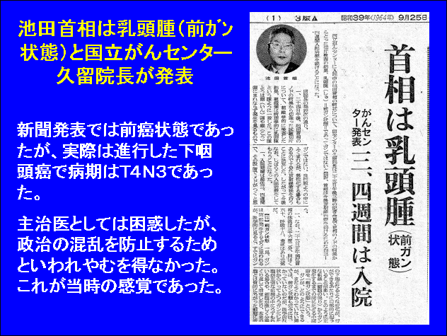 当時は癌告知などとてもできない時代でありました。この新聞発表は当時の政界の激動を避けるための、久留院長の苦渋に満ちた発言でした。しかしそうではあっても、前癌状態を治せない主治医といわれては、私としては立つ瀬がない思いでした。