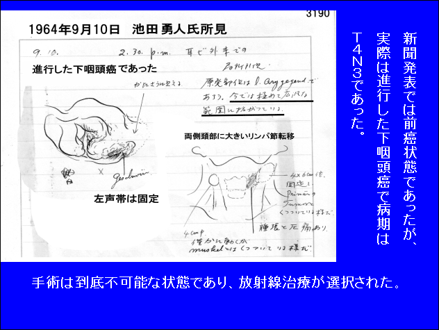 池田首相の下咽頭癌は誰が見ても末期がんの状態でとても治癒は望めませんでしたた。しかしリニアックとベータトロンによる放射線治療により、一時は原発部位の腫瘍もリンパ節転移も消失しました。しかし6ケ月後には局所に再発し、1年後に切除手術の直後に死亡されました。剖検記録には放射線治療はremarkably effective であったが治癒には至らなかったと記録されています。 実をいうと、ほとんど同じ時期に池田氏とそっくりの症状の症例がおられました、国立がんセンター外来で池田首相とほとんど同じ治療をしたところ、原発部位も転移も治癒して5年以上生存されました。この方は禅僧のように淡々とした人でありました。その無欲さが運命を分けたのかも知れません。このお二人のことは私に今もなお強い印象を残しています。