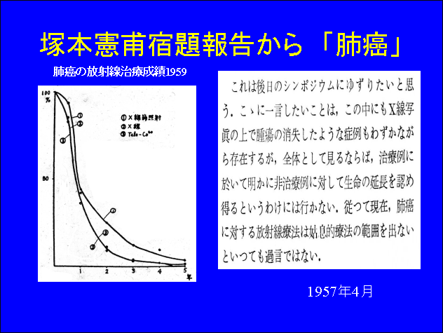 1957年の塚本憲甫先生の宿題報告からの引用です。この時代の肺癌の放射線治療成績として見るべきものは、金田弘氏によるX線篩照射がわずかながら治癒例を得たという報告のみでした。しかもこの治癒例の後遺症はかなりきびしかったようです。肺癌には当時の放射線治療では歯が立たないというのが塚本先生の結論でありました。