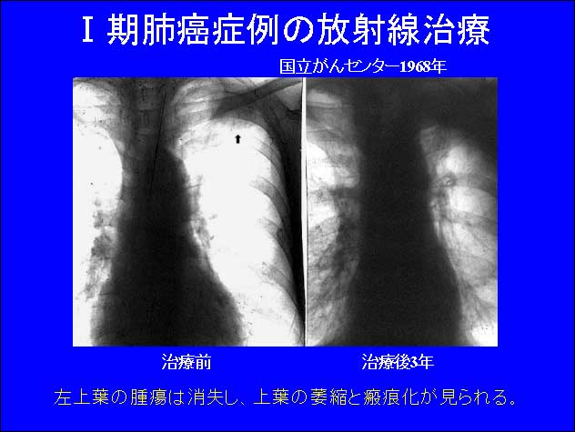当時の国立がんセンターでのT期肺癌の放射線治療は、照射範囲を原発部位に絞り、必要最小限の照射野でリニアックX線前後6門照射で9000ラド以上を照射するという方式で、現在さかんに行われるようになった定位照射法のさきがけでした。スライドに見られるように、肺癌はたしかに制御され治癒していますが、かなりの後遺症-放射性肺炎-を残していました。