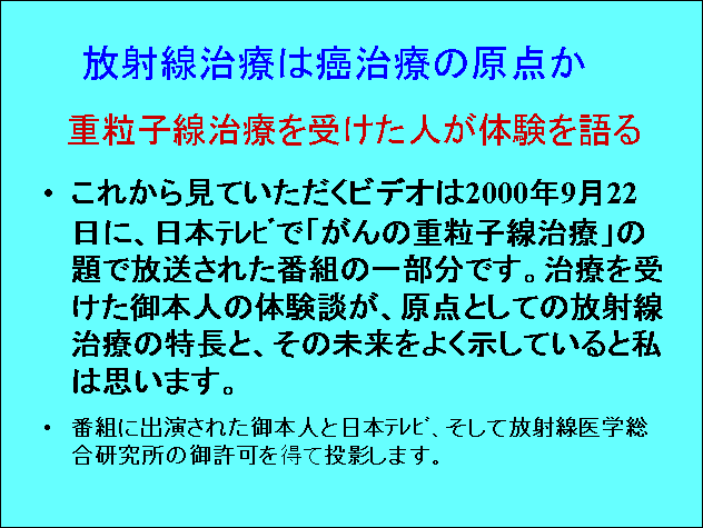 放射線治療は癌治療の原点といわれるのにふさわしいかどうか。この問いかけに本当に答えられるのは、実際に放射線治療を受けた人ではないかとと私は考えている。 これからお見せするビデオは、2000年9月22日に日本テレビが「がんの重粒子線治療」の題で放映した番組の一部です。放医研で8年前に重粒子線治療を受けられた上村さんが、御自分の体験を語られる言葉は訥々としていますが、何が癌治療の原点であるか、そして放射線治療がまさに癌治療の原点であることを、実によく示しておられるのです。このビデオを公開することについては、本人、そして日本テレビと放医研の許可を頂いております。