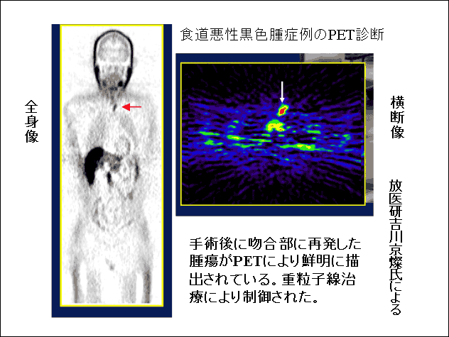 スライドは食道悪性黒色腫の手術を受けた症例の吻合部に再発した腫瘍がPETで鮮明に描出されていることを、全身像および横断像で示しています。食道癌のPET診断が何故保険適用外なのか理解に苦しみますね。