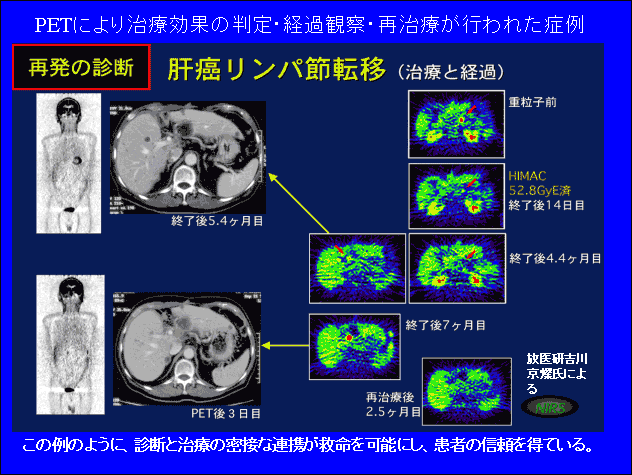 肝癌でもこの症例のように、CT-PET-重粒子線治療の連携プレーで、原発病巣の治癒の確認、リンパ節転移の発見と再治療そして治癒という粘り強い治療が可能になったことに私は感嘆しています。