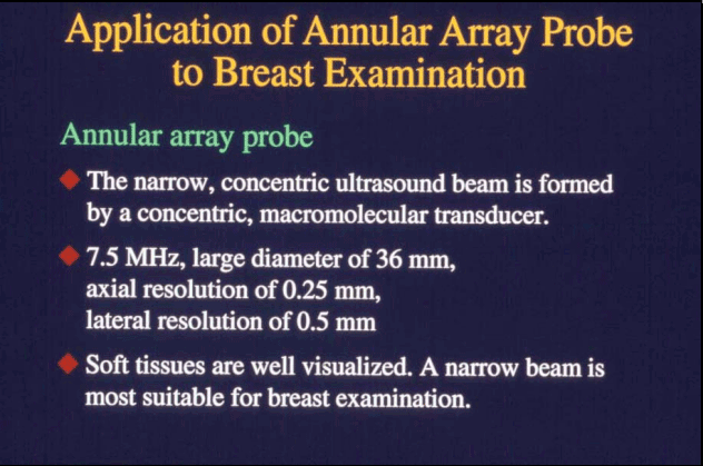 This method is very effective for the examination of the mammary gland. This is the probe being used to examine a patientfs breast.