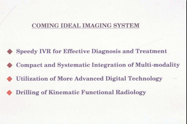I think that the future of diagnostic imaging will move in four directions. The first direction is increasing efficiency resulting from the integration of diagnosis and therapy. The second is the systemization and integration of multiple modalities. The third is progress in digital technology and its applications. And the fourth is dynamic assessment,which will focus on real-time imaging with display of dynamic functions.
